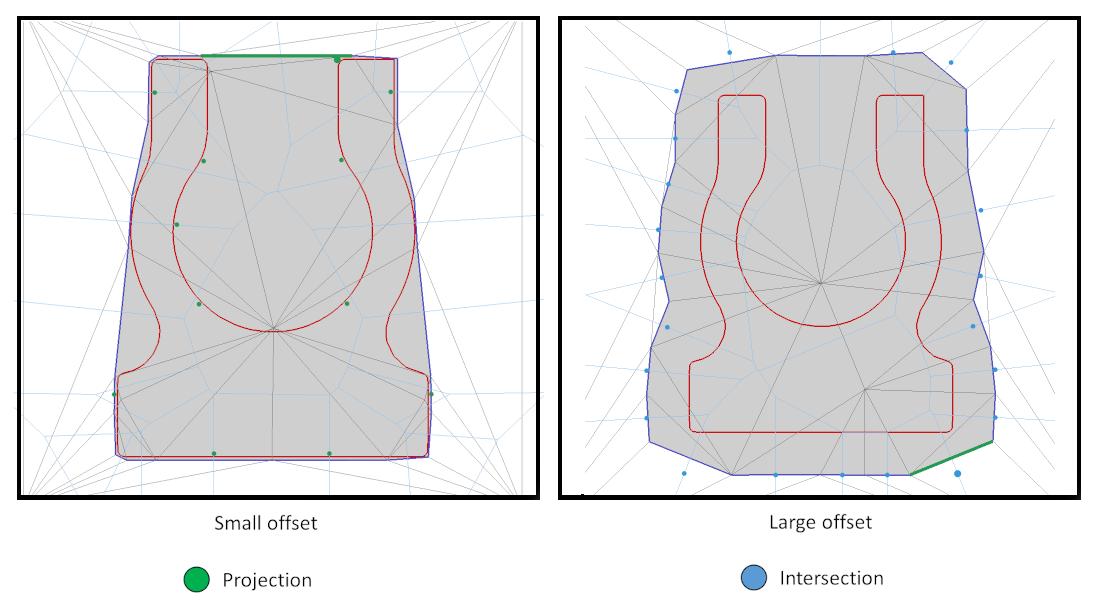 Figure 67.7 Steiner points. The projection Steiner points (green) are computed by projecting the triangle circumcenter onto the offset. The intersection Steiner points (blue) are computed as the first intersection point between the Voronoi edge and the offset. (Left) When the offset parameter is small, the algorithm produces more projection Steiner points, which tends to improve the preservation of convex sharp features. (Right) When the offset parameter is large, the algorithm produces more intersection Steiner points, which tends to generate triangles with better quality in terms of angles, in 3D.