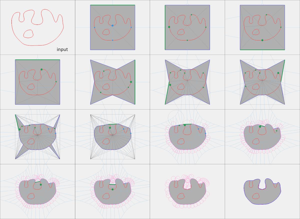 Figure 67.4 Steps of the shrink-wrapping algorithm in 2D. The algorithm is initialized by inserting the corners of the loose bounding box of the input (red) into a Delaunay triangulation, and all finite triangles are tagged inside (grey). The current gate (green edge) popped out from the queue is alpha-traversable. The triangle adjacent to the gate is tagged outside when it does not intersect the input, and new alpha-traversable gates are pushed to the queue. When the adjacent triangle intersects the input, a new Steiner point (large green disc) is computed and inserted into the triangulation, all neighboring triangles are tagged inside, new alpha-traversable gates are pushed to the queue, and traversal is resumed. Grey edges depict the Delaunay triangulation. Blue edges depict the Voronoi diagram. Pink circles depict the empty circle of radius alpha. The output edges (dark blue) separate inside from outside triangles.