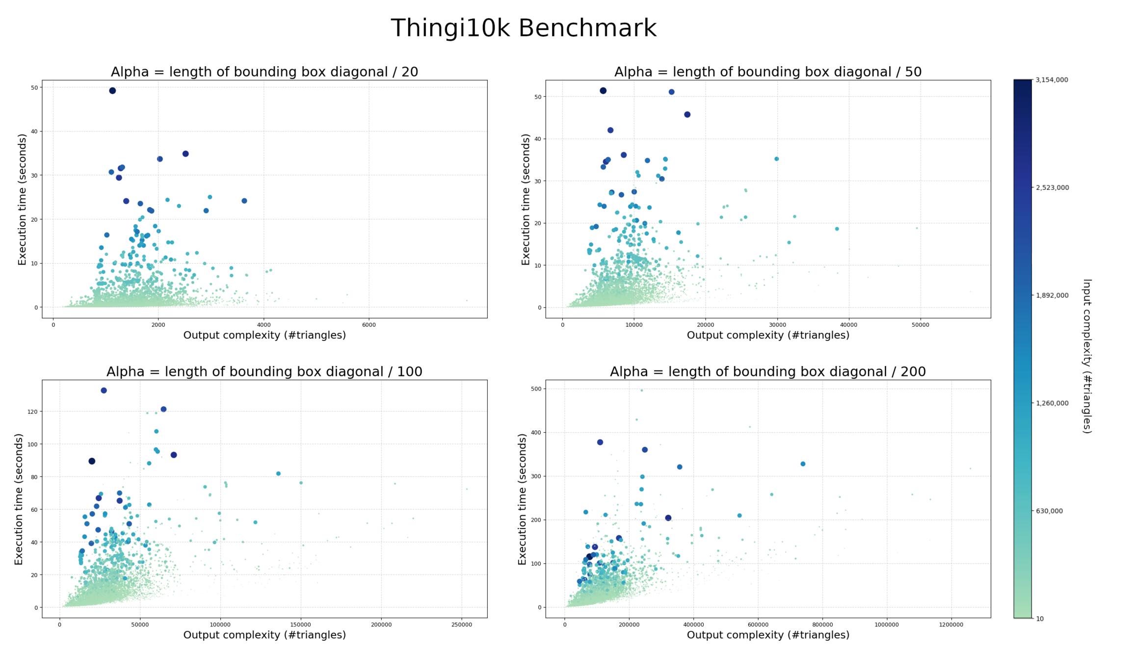 Figure 67.9 Execution times and output complexity for different values of alpha on the Thingi10k data set. Alpha increases from 1/20 to 1/200 of the length of bounding box diagonal. The x-axis represents the complexity of the output wrap mesh in number of triangle facets. The y-axis represents the total computation time, in seconds. The color and diameter of the dots represent the number of faces in the input triangle soup, ranging from 10 (green) to 3154000 (blue).