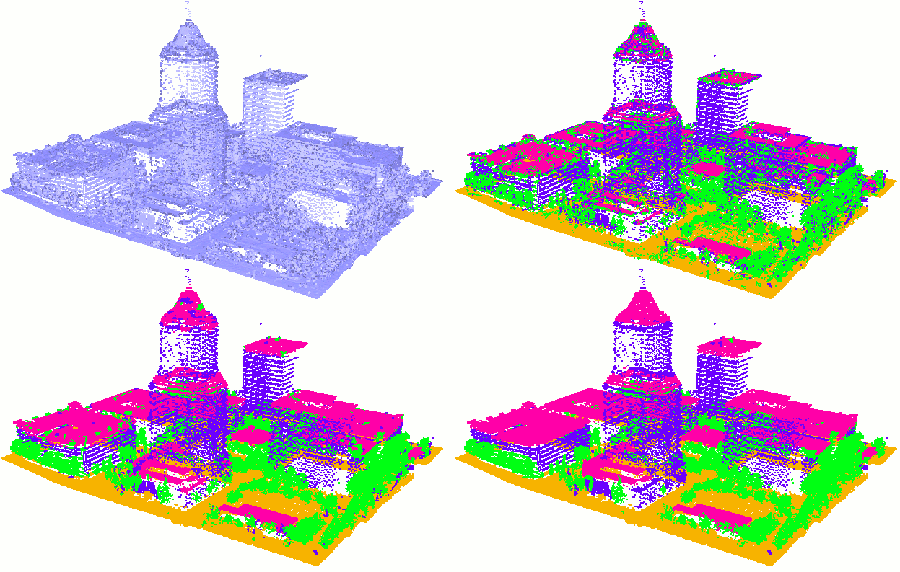Figure 91.7 Top-Left: input point set. Top-Right: raw output classification represented by a set of colors (ground is orange, facades are blue, roofs are pink and vegetation is green). Bottom-Left: output classification using local smoothing. Bottom-Right: output classification using graphcut.