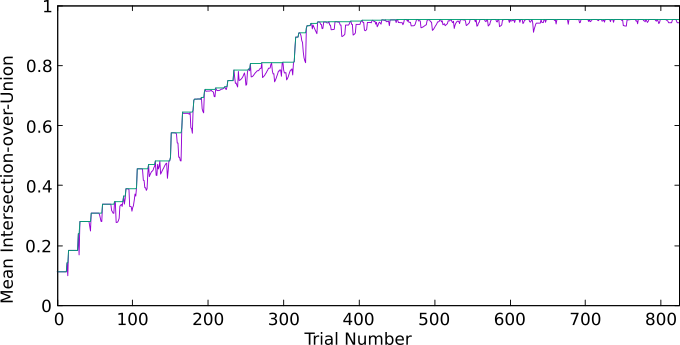 Figure 91.5 Example of evolution of the mean intersection-over-union. The purple curve is the score computed at the current iteration, green curve is the best score found so far.