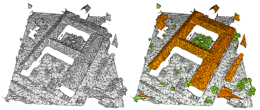 Figure 91.3 Example of mesh classification (left: input, right: output). Ground is grey, roofs are orange, vegetation is green.