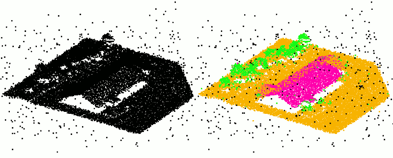 Figure 91.6 Example of classification on a point set with medium noise and outliers (left: input, right: output). Ground is orange, roofs are pink, vegetation is green. Outliers are classified with an additional label outlier in black.