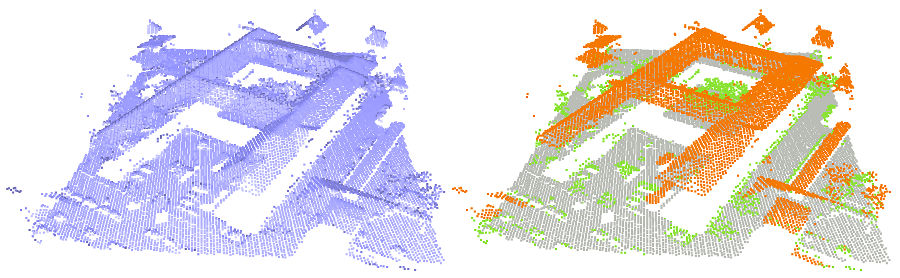 Figure 91.2 Example of point set classification (left: input, right: output). Ground is grey, roofs are orange, vegetation is green.