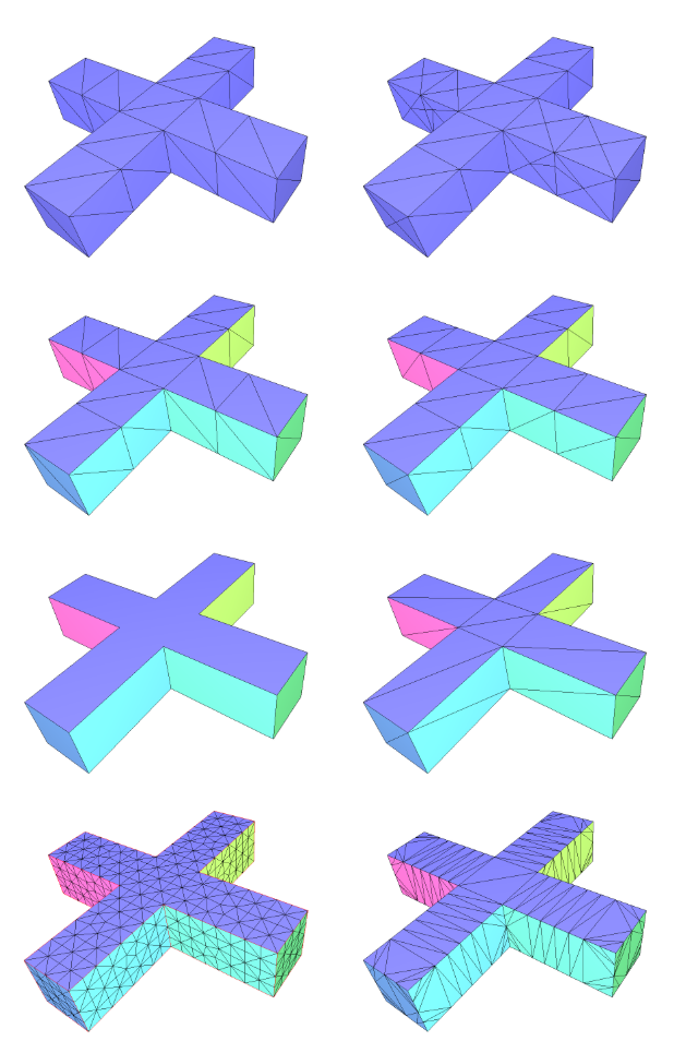 Figure Figure 50.5 shows the benefit of using the plc_face_id property map. On the last line of the figure, the input PLC is enriched with a segmentation of the planar faces, provided via the plc_face_id property map. In the resulting conforming constrained Delaunay triangulation, only the boundary edges of the PLC faces are constrained, while the other edges never get inserted as edges of the 3D triangulation.