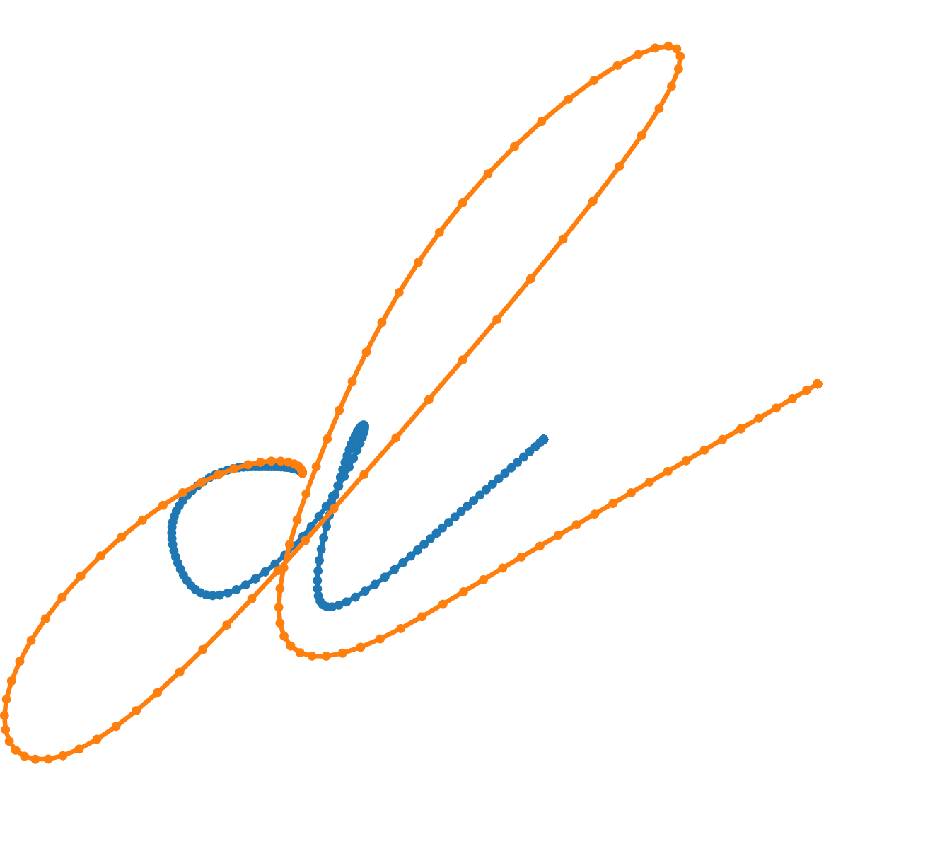 The following example shows how we can use is_Frechet_distance_larger() to determine if the Frechet distance between two polylines is larger than a given distance bound.