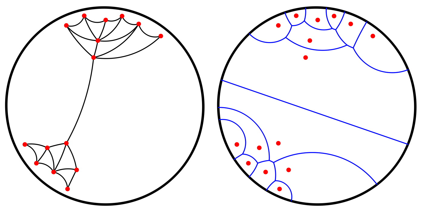 As hyperbolic circles coincide with Euclidean circles contained in the unit disk, the combinatorial structure of the hyperbolic Delaunay triangulation of a set \(\mathcal P\) of points in \(\mathbb H^2\) is a subset of the Euclidean Delaunay triangulation of \(\mathcal P\) (see Figure 45.2 - Left). More precisely, the hyperbolic Delaunay triangulation of \(\mathcal P\) only contains the simplices of the Euclidean Delaunay triangulation that are hyperbolic: