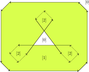 Figure 22.2 The convolution of a convex polygon and a non-convex polygon. The convolution consists of a single self-intersecting cycle, drawn as a sequence of directed line segments. Each face of the arrangement induced by the segments forming the cycle contains its winding number. The Minkowski sum of the two polygons is shaded. Dotted edges are not part of the reduced convolution.