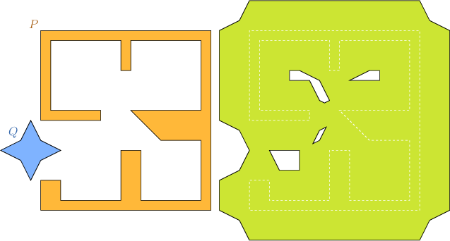 Figure 22.4 The Minkowski sum of two non-convex polygons \( P\) and \( Q\), as computed by the example programs Minkowski_sum_2/sum_with_holes.cpp and Minkowski_sum_2/sum_by_decomposition.cpp.