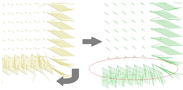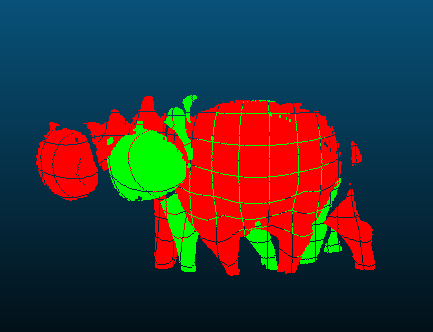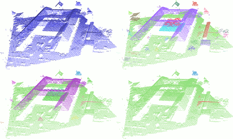 - Planes: inliers of each detected plane are replaced by sets of noise-free points sampled at the vertices of a regular grid: this is achieved by filling an occupancy grid aligned on the principal components of the inlier sets with a spacing lower than \(\sqrt{2}\) times the user-defined tolerance.