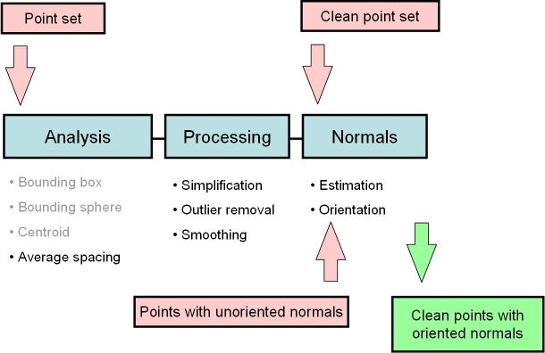 In the context of surface reconstruction we can position the elements of this component along the common surface reconstruction pipeline (Figure 87.2) which involves the following steps: