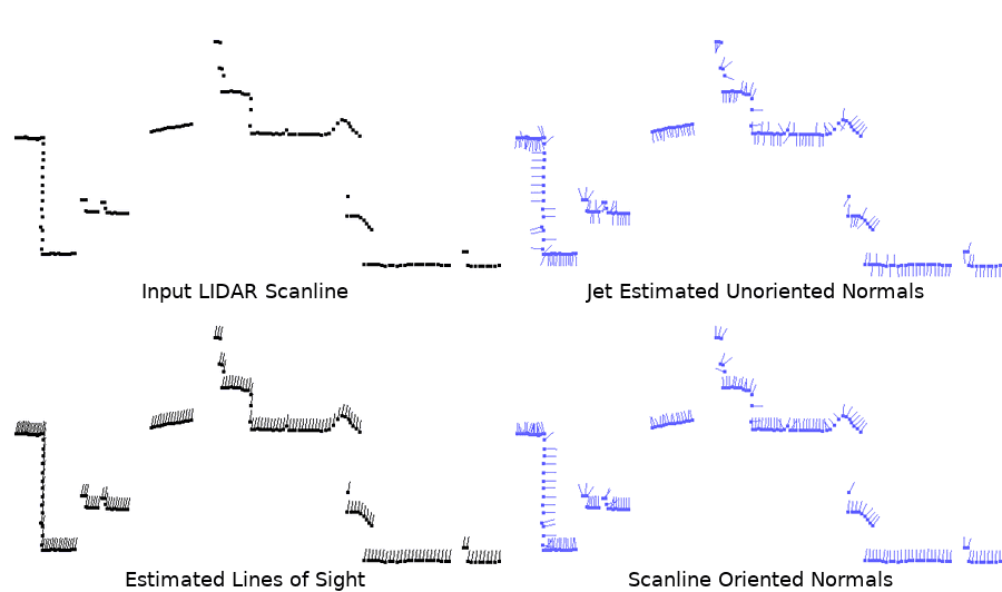 - Normal estimation and orientation when the normals are not already provided by the acquisition device; and