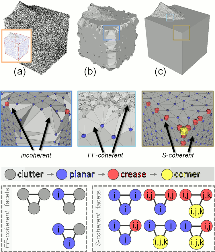 This algorithm is well suited to point sets sampled on surfaces with planar sections and sharp edges.
