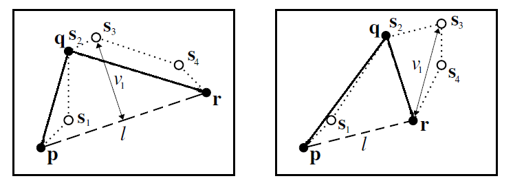 Let \(t_0,...,t_m\) be the points of the vertices adjacent to vertex q, different from p and r and let \( v_2 = \min \{ \mathrm{squared\_distance}((p,r), t_i) | i=0,..,n\}\). The cost of removing vertex q is \(v_1/v_2\), and it is +infinity when the set of points \({t_1..t_m}\) is empty (possible if the point q is on the convex hull). See also Figure 23.3.