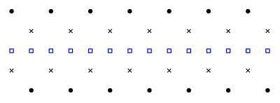 Figure 69.3 The black points and crosses show two different point sets. The blue boxes show both point sets at a higher scale. Note that given just the blue boxes, we cannot determine its point set at a lower scale.