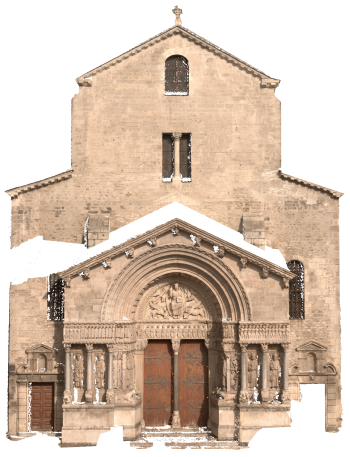 Figure 69.11 Left: A reconstructed surface with vertex coloring using the colors of the point set. Right: detail of the surface shown as wire-frame. Images or image-based modeling: MAP (Modèles et simulations pour l'Architecture et le Patrimoine) - UMR CNRS/MCC 3495.