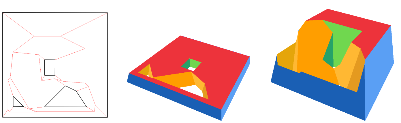 Figure 21.10 Input polygon with three holes and its weighted straight skeleton (left), and two extrusions of the skeleton with different maximum heights (middle and right).
