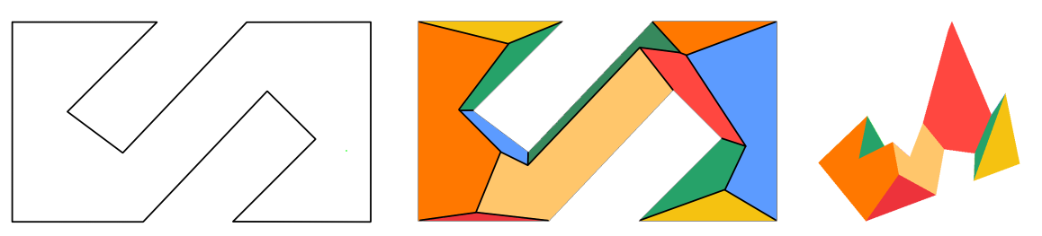 Figure 21.9 Input polygon (left), weighted skeleton with colored faces (middle), and extruded skeleton (right).