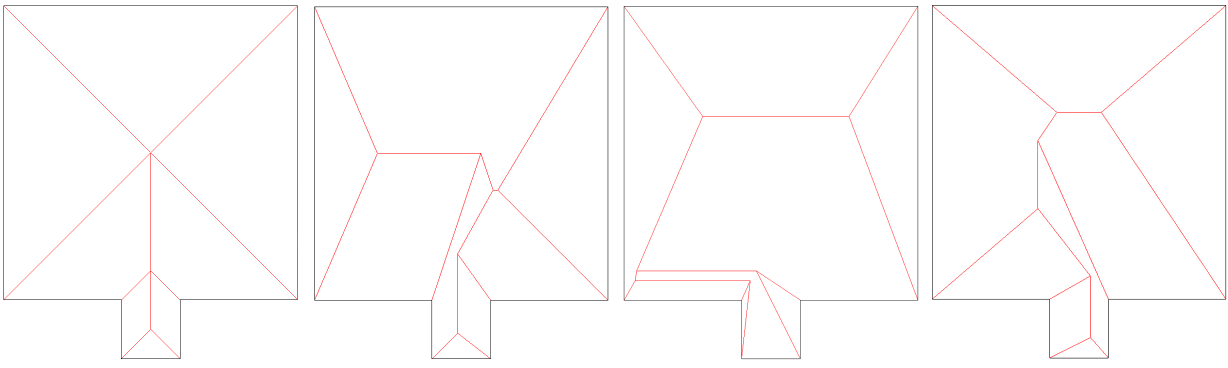 Perhaps the first (historically) use-case of straight skeletons: given a polygonal roof, the straight skeleton directly gives the layout of each tent. If each skeleton edge is lifted from the plane a height equal to its offset distance, the resulting roof is "correct" in that water will always fall down to the contour edges (the roof's border), regardless of where it falls on the roof. Laycock and Day [4] give an algorithm for roof design based on the straight skeleton.