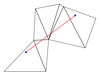 A geodesic curve is a locally shortest path on the surface of some manifold, that is, it cannot be made shorter by some local perturbations. On a surface mesh, this translates to a curve where, when the faces crossed by the curve are unfolded into the plane, the curve forms a straight line. Another way of describing it is that there is exactly \(\pi\) surface angle to both sides at every point along the curve (except possibly at the curve's endpoints).
