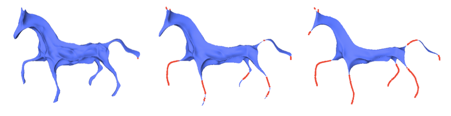 As a proof of concept, we show how to use the skeleton and the association of input vertices to skeleton to compute a segmentation of the input triangulated surface mesh using the package Triangulated Surface Mesh Segmentation. The segmentation algorithm consists in computing a shape diameter function for each face of the input mesh, followed by solving a graph cut problem. Here we use the skeleton to define a new shape diameter function. Specifically, for each face we compute the diameter value as the average distance between its three incident vertices and their corresponding skeletal point. The result of this segmentation is shown in Figure 82.4.