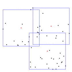 Bounding volumes also define geometric ``center points'' of objects. For example, if two objects are to be matched (approximately), one approch is to first apply the translation that maps the centers of their smallest enclosing spheres onto each other. Simpler centers are possible, of course (center of gravity, center of bounding box), but more advanced bounding volumes might give better results in some cases. It can also make sense to consider several center points instead of just one. For example, we provide algorithms to cover a planar point set with between two and four minimal boxes (CGAL::rectangular_p_center_2). Below is an example covering with three boxes; the center points are shown in red.