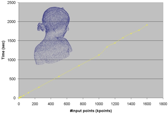Figure 47.13: Poisson implicit function computation duration (in s) against the number of points for the Bimba con Nastrino point set with 1.6M points (shown) as well as for simplified versions.