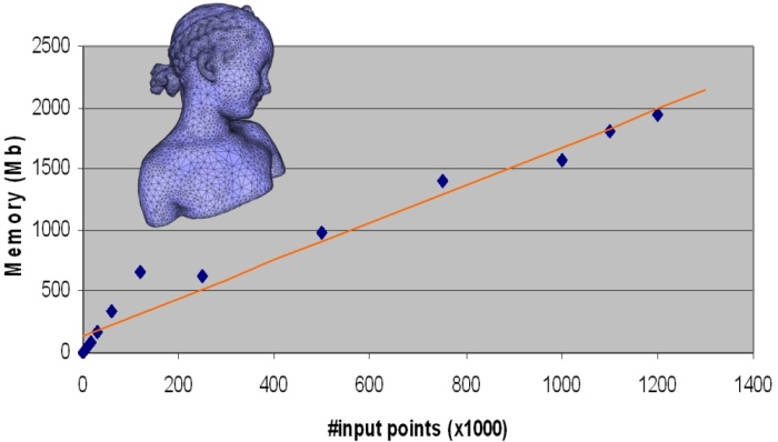 We provide some performance numbers for scanning data. We measure the Poisson implicit function computation time, the contouring time for a range of approximation distances, the memory occupancy as well as the influence of the point set simplification. The machine used is a PC running Linux 32 bits with an Intel CPU Core 2 processor clocked at 3 GHz and with 3 GB of RAM. The software is compiled with g++ 4.3.1 compiler with the 03 option which maximizes speed.