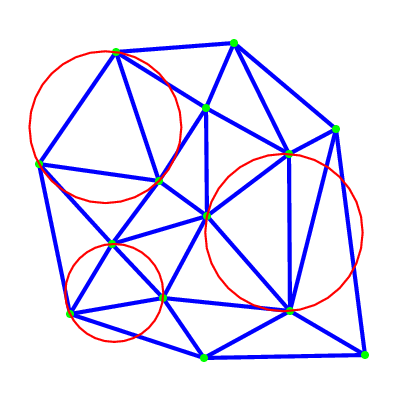 The triangulation class also provides methods to locate a point with respect to a given finite face of the triangulation or with respect to its circumcircle. The faces of the triangulation and their circumcircles have the counterclockwise orientation.
