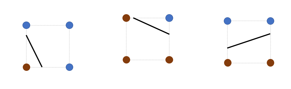 Figure 64.3 Marching Cubes vs Topologically Correct Marching Cubes. Some vertex values can represent complex surfaces within a single cell: on the left, the values at the vertices of the cell have been interpolated within the cell and correspond to a tunnel-like surface. This surface is not correctly recovered when applying the cases of the Marching Cubes algorithm to the cell: 2 independent disk-like sheets are created (middle). However, by inserting new vertices, TMC correctly captures the topology within a single cell (right).